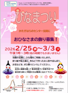 折り紙や粘土細工、布などで作ったお人形やぼんぼり、お花などをぜひ飾りにいらしてください。当館の玄関にひな壇を用意しています。一緒に春の訪れを楽しみましょう。