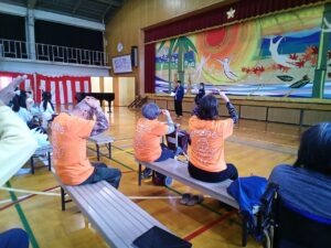 ステージでは、「京の通り名」と「川の流れのように」の体操を披露しました。日頃の体操の成果を披露する機会とあって、少し緊張される方もおられましたが、音楽に合わせて体を動かすうちに自然と笑顔に。